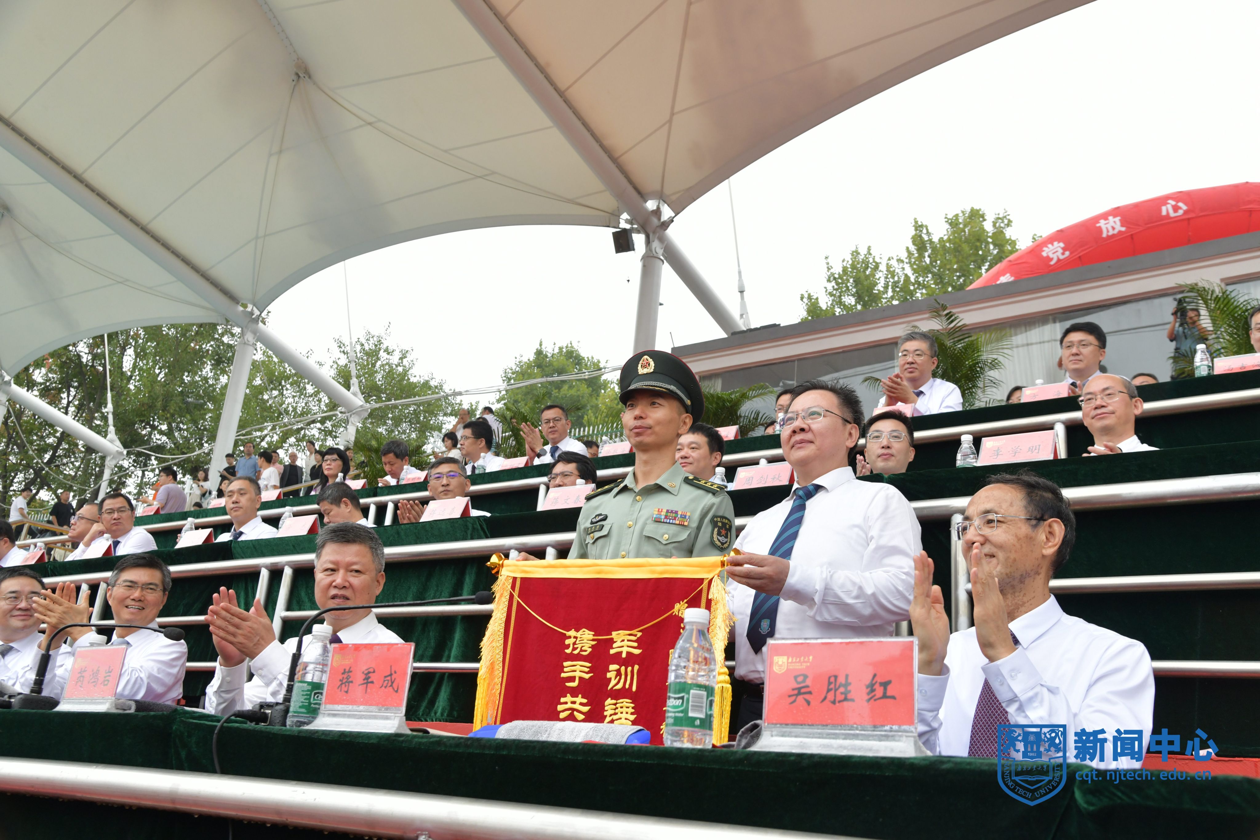 上午八點半,在升國旗儀式后,軍訓匯報考核正式開始。新生們通過隊形的變化和道具呈現了“請黨放心 強國有我” “明德 厚學 沉毅 篤行”等字樣,表達了迎接新中國成立75周年的喜悅之情。在分列式展示中,新生們組成若干方陣,精神飽滿、隊列整齊地通過主席臺,充分展示了青春激揚的風采。隨后分別進行了捕俘拳、匕首操、棍盾術、刺殺操、戰術等展示。匯報考核結束后,主席臺前排領導和嘉賓為軍訓先進集體和先進個人代表頒獎。學生代表向承訓教官代表獻花,蔣軍成向承訓部隊贈送錦旗。期間,舉行了退伍大學生光榮返校儀式。