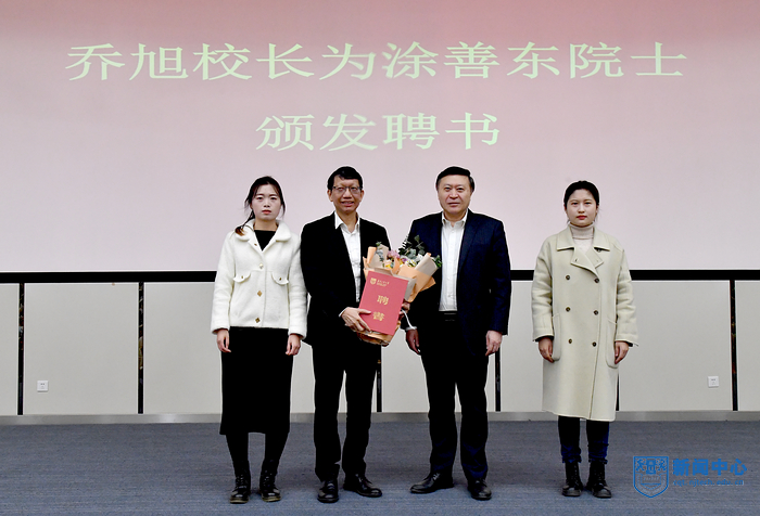 校長喬旭為涂善東院士頒發聘書、佩戴校徽