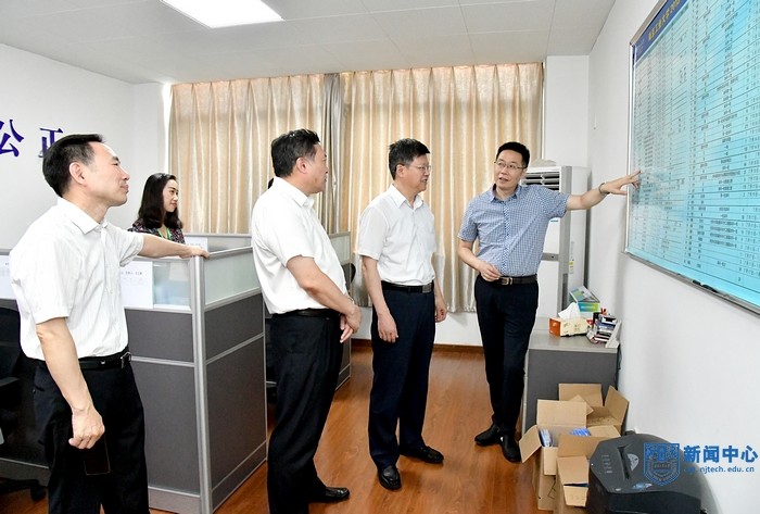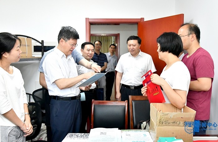 7月17日上午,校黨委書記芮鴻巖、校長喬旭、副校長崔益虎來到虹橋校區招生辦公室遠程錄取現場,察看我校2018年招生錄取工作,親切慰問了錄取現場的工作人員。