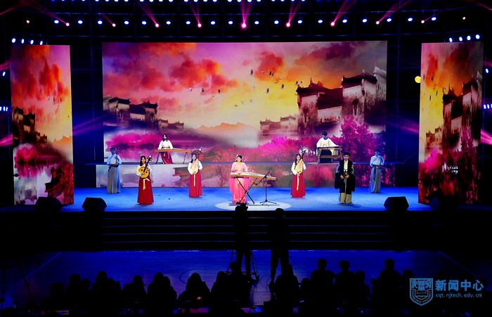 晚會在雄渾激昂的管樂合奏《世紀序曲》中拉開帷幕。音詩畫《南工印跡》訴說了2018級學子帶著對夢想的期冀相聚南工的欣喜之情。師生代表共同演繹的原創散文詩朗誦《我的南工,我的夢》,展現了學校在高水平大學建設征程中,吐故納新、上下求索的奮斗歷程和一代代南工人追尋夢想的奮進之路。音樂劇《美好的回憶》、無伴奏清唱《那些年的小幸運》形式新穎,令人陶醉。中外學生聯合參演的創意節目《中華情》重現了鄭和下西洋的恢弘歷史,表達了南工人放眼大世界、胸懷大格局,交融文化、共謀發展的決心和勇氣。民樂合奏《織夢行云》、武術舞蹈《武四季》演繹了中華傳統文化的博大精深,由新生軍訓教官表演的舞蹈《兵王》盡顯軍人颯爽英姿。小品《永恒的信仰》以中科院資深院士、我國化工高等教育一代宗師、我校教授時鈞先生事跡為原型,詮釋了時鈞先生一生向黨、甘為人梯的高尚情操和對信仰的永恒追求。由蟲蟲吉他社、下加一線音樂社、潮爆公社、浦園舞協等9家學生社團帶來的串燒表演《青春節拍》充分展示了校園文化生活的豐富多彩。晚會在歌伴舞《錦繡前程》中落下帷幕,優美的歌聲表達了全體師生對祖國繁榮昌盛的美好祝愿。