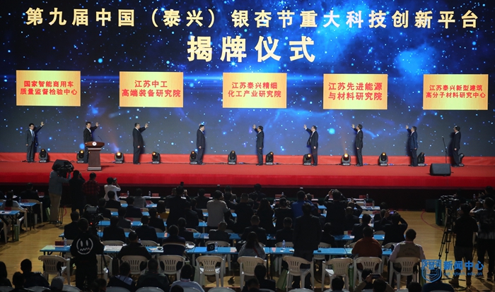 在第九屆中國(泰興)銀杏節啟動儀式上,喬旭校長和中國科學院院士李亞棟、中國工程院院士繆昌文、泰興市有關領導共同為江蘇泰興精細化工產業研究院等新型研發機構揭牌。喬旭校長在致辭中希望校地雙方以此為契機,不斷深化合作領域,充分發揮我校學科、科研、人才優勢和泰興經濟開發區產業、環境、政策優勢,積極探索互利共贏發展的新機制、新模式,共同為江蘇化工產業轉型升級貢獻力量。