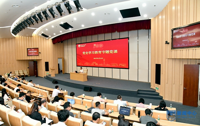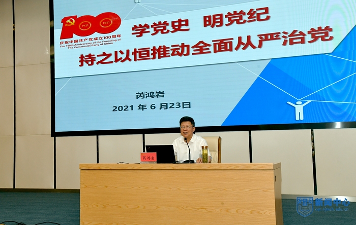 按照學校黨史學習教育計劃安排,6月23日上午,黨委書記芮鴻巖以“學黨史 明黨紀 持之以恒推動全面從嚴治黨”為題,為各基層黨委(黨工委、黨總支)書記及師生黨支部書記代表講授專題黨課。省委教育工委派出第一指導組成員汪侃到場指導。