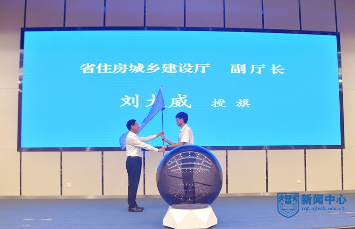 劉大威副廳長、喬旭校長、張健部長、路宏偉處長共同觸摸球屏,啟動參賽出征儀式。隨后,劉大威副廳長為我校參賽出征團隊授旗。