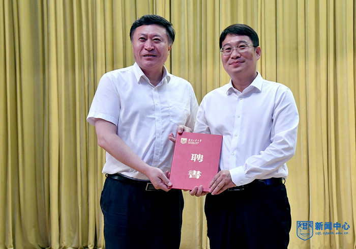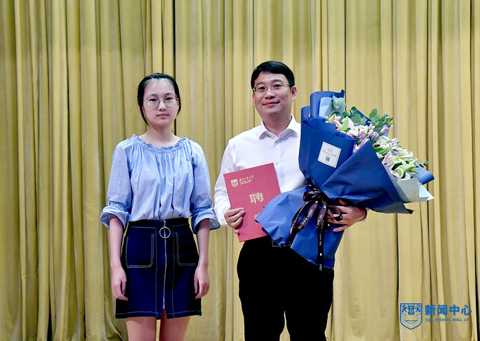報告會開始前,學校舉行了聘任陳衛國校友為思想政治理論課特聘教授儀式,喬旭校長為他頒發聘書,學生代表獻花表達敬意。