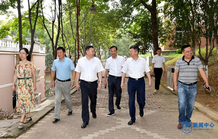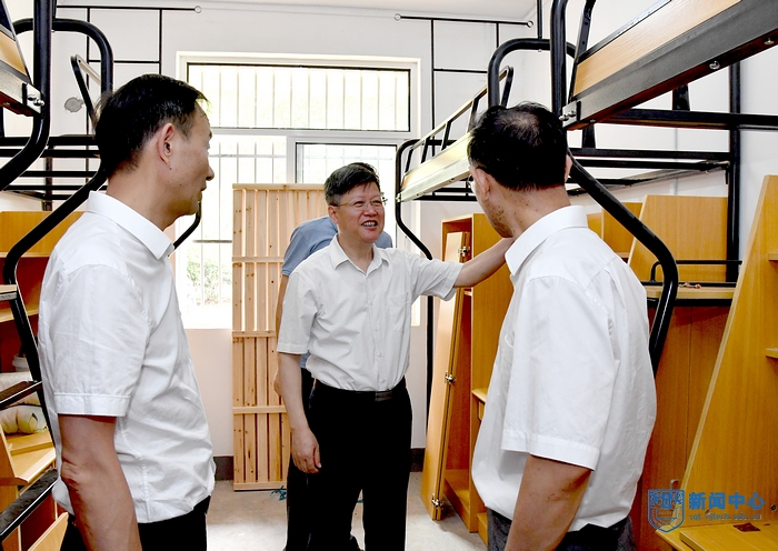 校領(lǐng)導一行先后來到南苑餐廳、東苑宿舍區(qū)、西大門崗亭、水塔變電所、老校門復建現(xiàn)場、仁智樓、明齋和新建學生宿舍工地等處,詳細了解各單位、各部門為新學期所做的準備工作,并親切慰問一線教職員工。