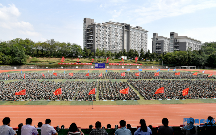 軍訓旅副旅長鄭鵬整隊報告,軍訓動員大會正式開始,劉良棟上校宣讀2019級本科新生軍訓旅建制,副校長吳勝紅向軍訓旅授軍旗。2011學院書院1901班張恒同學、陸**程大學史路榮同志分別代表全體新生和軍訓教官發言。