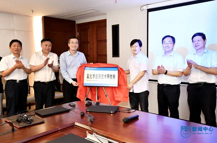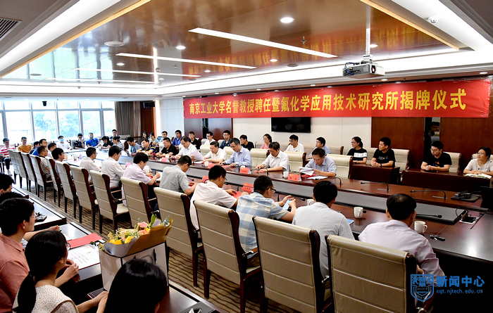 科學研究部部長管國鋒宣讀“關于成立南京工業大學氟化學應用技術研究所的決定”,胡金波教授和發起人馮超教授共同為研究所揭牌。