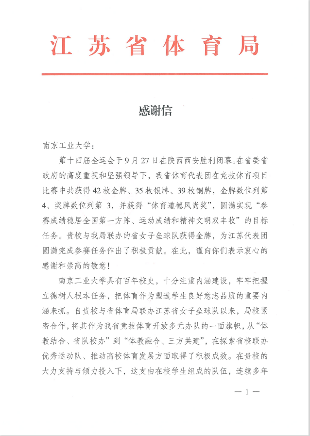 10月9日,江蘇省體育局專程向我校發(fā)來感謝信,對我校與省體育局、常州市聯(lián)辦的“南京工業(yè)大學(xué)—江蘇省女子壘球隊”在第十四屆全運會上再次蟬聯(lián)冠軍,為江蘇省代表團完成目標(biāo)任務(wù)做出的重要貢獻表示衷心的感謝和崇高的敬意!
