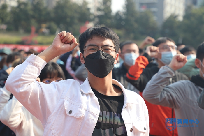 開(kāi)學(xué)典禮正式開(kāi)始前,全體師生合唱《沒(méi)有共產(chǎn)黨就沒(méi)有新中國(guó)》《我和我的祖國(guó)》,全場(chǎng)新生齊誦:“今天,我們堅(jiān)定前進(jìn)的方向,為中華民族偉大復(fù)興的中國(guó)夢(mèng)貢獻(xiàn)青春力量,請(qǐng)黨放心,強(qiáng)國(guó)有我!請(qǐng)黨放心,強(qiáng)國(guó)有我!”