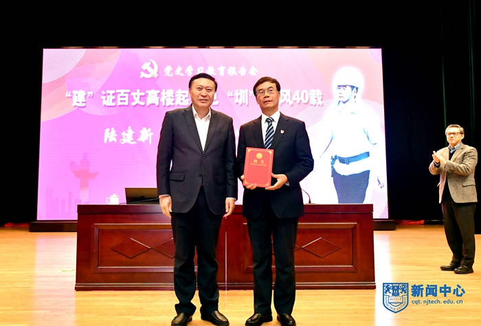 報告會上,鞏建鳴副校長宣讀關于聘請陸建新為南京工業大學課程思政教學研究中心特約研究員的決定。喬旭校長為陸建新頒發聘書。學生代表為陸老師獻花,表達敬意和謝意。