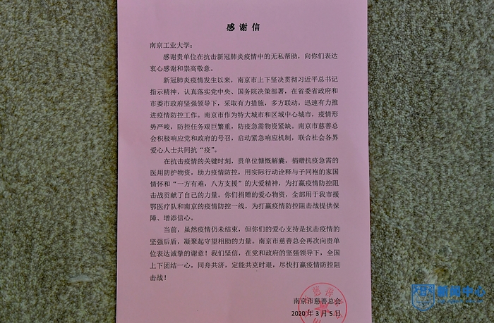 喬旭校長代表學(xué)校向南京市慈善總會捐贈物資,陳學(xué)榮副會長為其頒發(fā)感謝信和捐贈證書。喬旭校長表示,自疫情發(fā)生以來,學(xué)校積極組織各方力量,通過非洲、歐洲等海外校友會和國內(nèi)各地校友會,積極開展醫(yī)用防護口罩和防護服等防控緊缺物資的籌措和采購工作。海外籌措的醫(yī)用防護緊缺物資歷時一個多月,幾經(jīng)輾轉(zhuǎn),目前已陸續(xù)運抵學(xué)校。在學(xué)校得知到南京疫情防控一線醫(yī)護人員醫(yī)用防護物資相對短缺的情況后,立即向南京市有關(guān)方面表達了捐贈意愿,為打贏疫情防控總體戰(zhàn)、阻擊戰(zhàn)做出貢獻。市人大迅速與市慈善總會及市疫情防控指揮部取得聯(lián)系,落實學(xué)校捐贈事項。此次,南京工業(yè)大學(xué)為南京疫情防控一線醫(yī)護人員捐贈物資價值35萬元,包括FFP2型醫(yī)用防護口罩5000只、Type5型醫(yī)用防護服500件、消毒片20000片等。