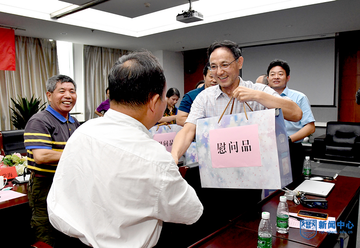 座談會結束后,與會校領導向退役軍人代表發(fā)放慰問品并合影留念。