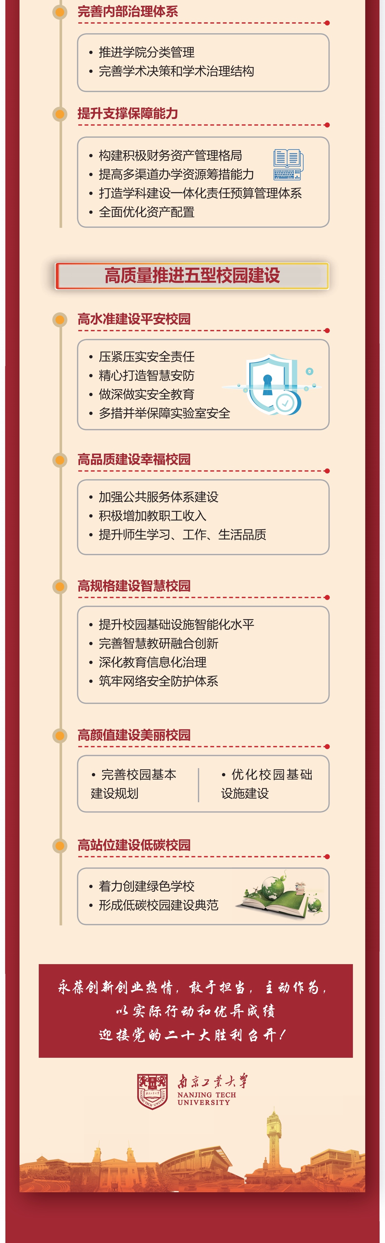 “十四五”時期是我國開啟全面建設社會主義現代化國家新征程、向第二個百年奮斗目標進軍的第一個五年,是我省切實履行“爭當表率、爭做示范、走在前列”光榮使命,奮力譜寫“強富美高”新江蘇現代化建設新篇章的關鍵時期,也是學校聚焦高水平大學建設和一流學科創建,奮力建成國內一流國際知名創業型大學的重要戰略機遇期和攻堅期。全校師生將在學校黨委堅強領導下,緊扣學校建設目標和主攻方向,將學習宣傳學校“十四五”規劃的內涵實質同落實規劃的重點任務及重要舉措結合起來,瞄準“質量、特色、貢獻”,精準發力,久久為功,爭當規劃落實的先行者、推動者、實踐者,以“奮進之筆”書寫南京工業大學高質量發展的新篇章。