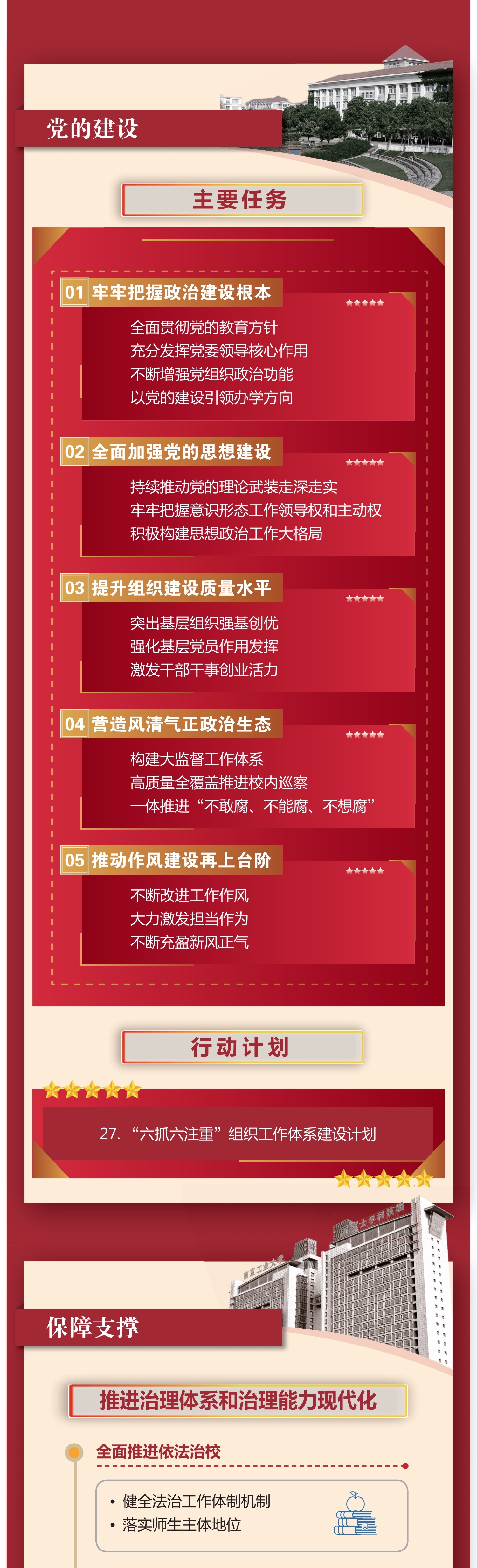《規劃》總計3.6萬字,分為發展環境、主要目標、主要任務、保障支撐、組織實施五個部分,是學校“十四五”發展規劃體系的統領。《規劃》確立了初步建成國內一流國際知名創業型大學的“十四五”發展目標和70余項主要指標。《規劃》提出,重點推進落實立德樹人根本任務、建設高峰凸顯的學科生態體系、打造高素質師資隊伍、提升科技攻關與協同創新體系化能力、開拓國際交流合作新空間、弘揚創業型大學文化等六大重點任務,堅持與江蘇省高水平大學建設高峰計劃聯動,重點實施27個行動計劃。《規劃》明確,全面加強黨的領導,推進治理體系和治理能力現代化,高質量推進平安校園、幸福校園、智慧校園、美麗校園、低碳校園等五型校園建設。