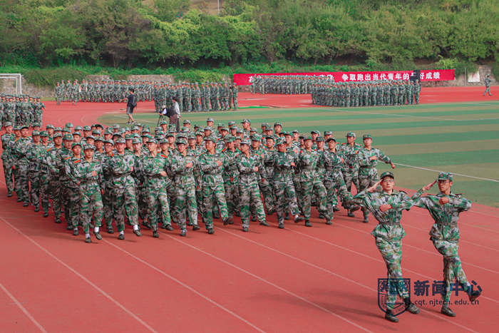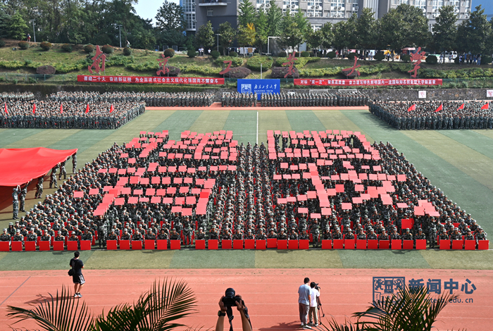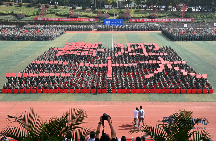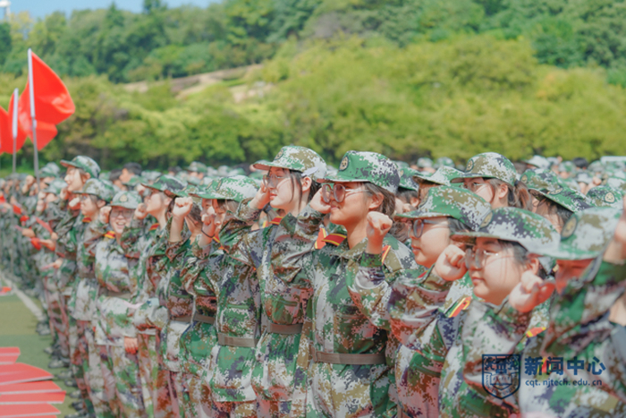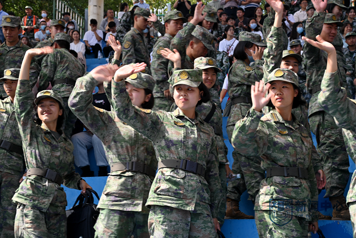 軍訓(xùn)匯報(bào)開(kāi)始前,全體師生合唱《沒(méi)有共產(chǎn)黨就沒(méi)有新中國(guó)》《我和我的祖國(guó)》,全場(chǎng)新生齊誦:“今天,我們堅(jiān)定前進(jìn)的方向,為中華民族偉大復(fù)興的中國(guó)夢(mèng)貢獻(xiàn)青春力量。請(qǐng)黨放心,強(qiáng)國(guó)有我!”