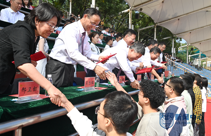 開(kāi)學(xué)典禮上,芮鴻巖書(shū)記宣讀了《關(guān)于表彰2022級(jí)碩士研究生“校長(zhǎng)特別獎(jiǎng)學(xué)金”獲獎(jiǎng)學(xué)生的決定》,主席臺(tái)前排領(lǐng)導(dǎo)為獲獎(jiǎng)代表頒獎(jiǎng)。
