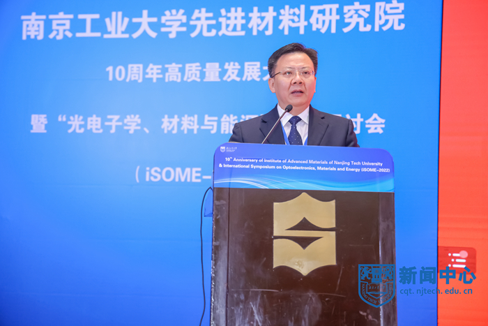 10月7日,先進材料研究院10周年高質量發展大會暨“光電子學、材料與能源”國際研討會(iSOME-2022)在南京召開。南京工業大學黃維院士、南京航空航天大學郭萬林院士、大連理工大學彭孝軍院士、東南大學崔鐵軍院士、哈爾濱工業大學冷勁松院士、華南理工大學馬於光院士,澳大利亞科學院趙惠軍院士、新加坡國家科學院和新加坡工程院劉斌院士、陳曉東院士、新加坡國家科學院劉小鋼院士等來自多個國家和地區的10余位院士及300余位專家和青年學者參會。大會由我校柔性電子(未來技術)學院、先進材料研究院與有機電子與信息顯示國家重點實驗室、npj Flexible Electronics期刊聯合主辦。校長蔣軍成出席大會。開幕式由副校長郭萬牛主持。