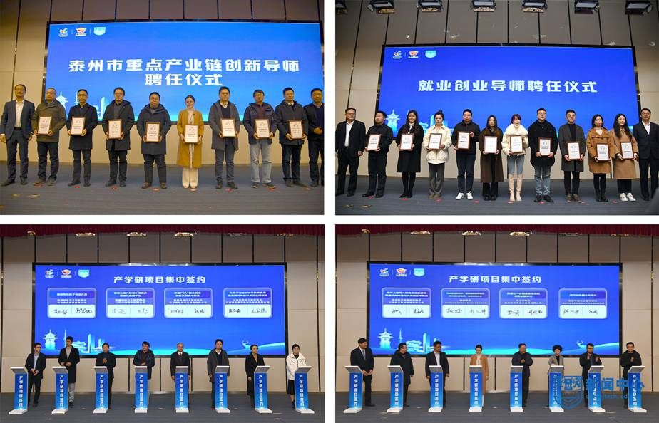 會上,蔣軍成校長與梁三元部長共同為南京工業大學泰州市引才工作站揭牌;凌祥副校長與孫靚靚區長分別代表學校和姜堰區政府簽署了戰略合作協議;劉大衛副校長與黃衛平副秘書長為泰州市重點產業鏈創新導師團新聘導師頒發聘書;姜堰區委副書記、副區長潘勇,姜堰區委常委、組織部部長劉禪為新聘的姜堰區就業創業導師頒發聘書;材料科學與工程學院等單位分別與8家泰州當地企業簽訂項目合作協議。