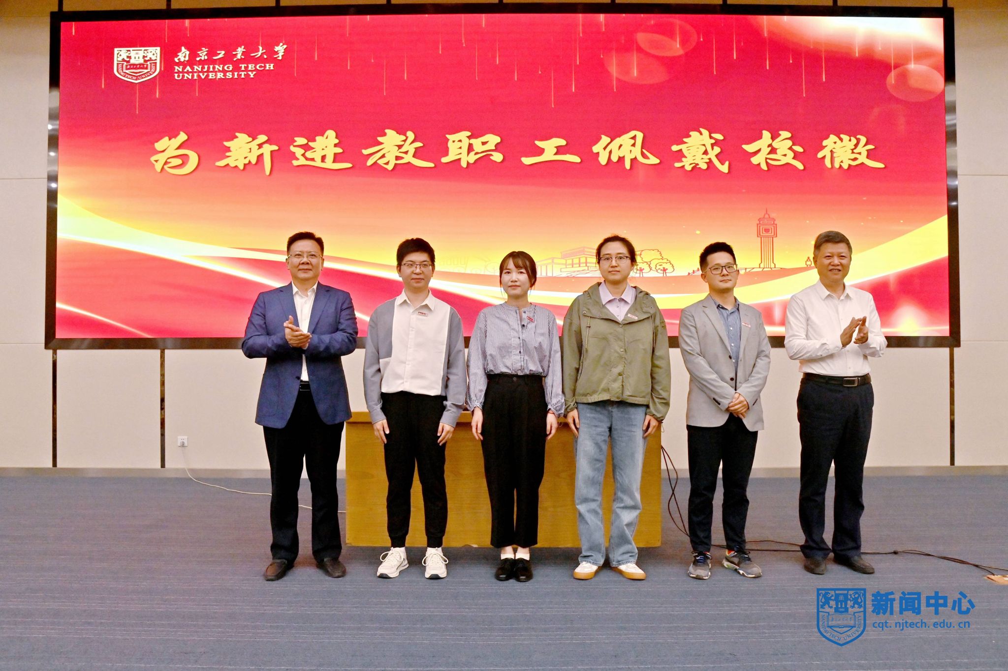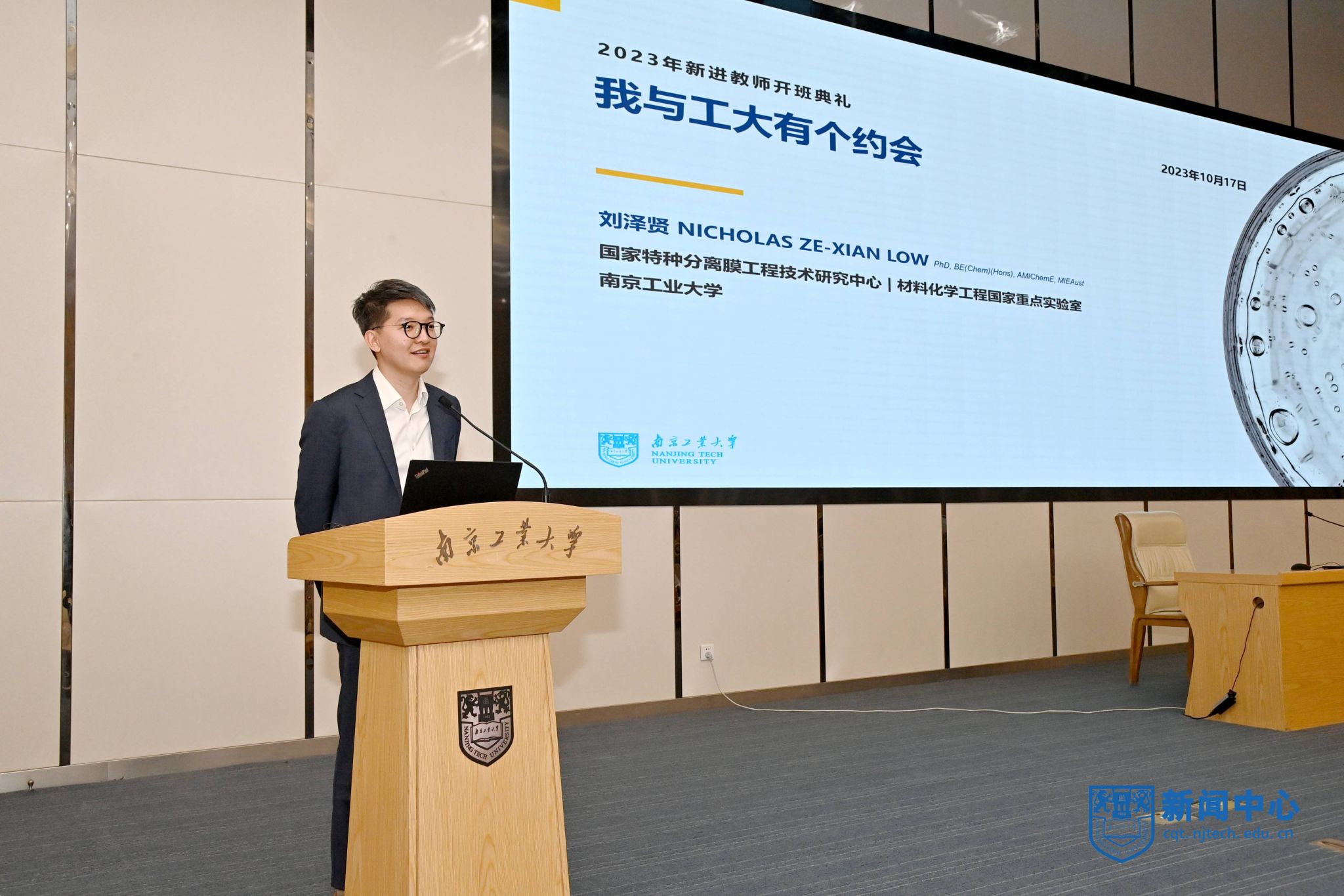 會上,四位新進教職工代表上臺接受了佩戴校徽儀式;新進教職工代表馬來西亞華裔,化工學院、國家特種分離膜工程技術研究中心劉澤賢老師作分享發言。