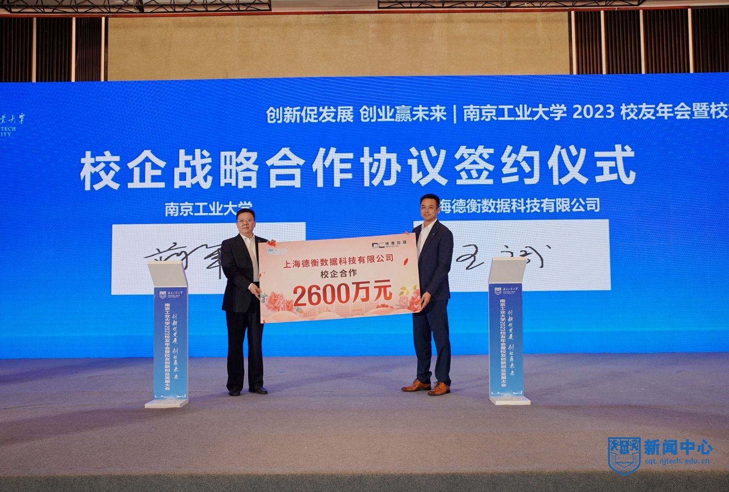 校友企業上海德衡數據科技有限公司捐款100萬元設立獎教金,投入2500萬元共建南工大—上海德衡創智研究院。蔣軍成與校友王斌董事長現場簽約。