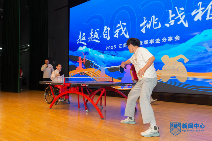 在分享中,鉛球冠軍姚娟率先以《堅守初心捍衛榮耀》為題作分享,她回顧從田徑場轉戰殘奧會的艱辛歷程,坦言“身體殘缺不是終點,而是奮斗的起點”。擊劍冠軍馮彥可以《堅持住才會與眾不同》為題講述傷病重拾信心的心路,強調“意志是人生最鋒利的劍”。乒乓球冠軍張變圍繞《在逆境中斗志昂揚》講述從遭遇人生變故到站上世界最高領獎臺的路,她堅信“真正的強者不是沒有眼淚,而是含著眼淚依然奔跑”。在互動環節,學生踴躍提問,冠軍們鼓勵大家在面對困境時,要保持積極樂觀的心態,把挫折當作成長的階梯。活動現場,同學們紛紛上臺與張變、馮彥可完成了一場乒乓球友誼賽,孫剛傳授同學們擊劍不同的握法和比賽規則,現場掌聲不斷、氛圍熱烈。