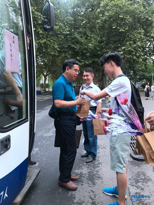 9月10日清晨7點(diǎn)半,第一班校車緩緩駛?cè)牒駥W(xué)停車點(diǎn)。同學(xué)們舉著“教師節(jié)快樂”的牌子走向下車點(diǎn),為每位老師獻(xiàn)上鮮花和潤喉糖,深情鞠躬,送上祝福:“老師,您辛苦啦!”