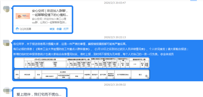 從2月初開始,輔導員王菲老師就開始反復強調不要提前返校,要求同學們報告各類信息和異常情況。雖然我們學院2018級沒有湖北籍同學,但是在寒假回家過程中,有部分同學經停武漢或者接觸過從武漢返家的親友,不免讓人擔心。于是在班長們的組織下,每個同學都重視起來,有接觸史的同學主動申報登記,所有人每天在班級群定時進行身體情況等接龍報告。