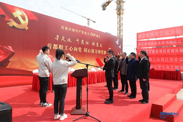 黨員師生代表一行首先抵達中建一局二公司南京數碼港項目,在會議室聆聽公司及項目情況介紹,深入了解了企業發展的文化與歷史。隨后,前往項目工地現場參觀,與公司黨員進行深入交流,學習項目工程的先進做法。最后,來到三毛廠項目部參加同心接力繡黨旗活動,與公司領導一起重溫入黨誓詞、演唱革命歌曲并接力繡黨旗。