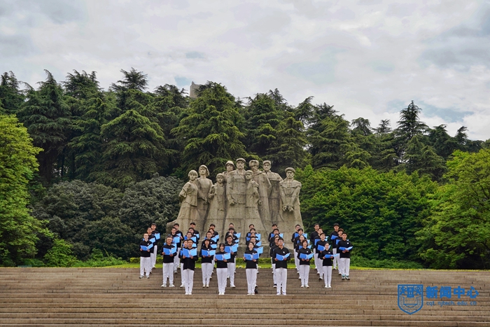 蒼松翠柏環繞的烈士群雕廣場莊嚴肅穆,全體參加人員滿懷深情面向烈士群雕默哀致敬,并逐一獻上代表誠摯心意的菊花,感恩逝去的英烈。隨后全體師生在烈士群雕下誦讀了師生共同創作的詩歌《雨花臺祭英烈》。四位師生領誦者將人們的思緒拉回那個紅色的年代,八位教師代表深切緬懷那些用鮮血和意志譜寫的偉大篇章,全體師生集體向為自由真理、民族復興、人類和平而犧牲的英雄們致敬、禮贊。鏗鏘有力、莊嚴堅定的聲音響徹廣場,整齊劃一、精神飽滿的誦讀者更是引來眾多園區參觀者駐足欣賞、拍照留影。參加拍攝活動的師生一致表示,這是一場極其生動的黨史學習教育,也是一次愛國主義精神的洗禮,無數仁人志士拋頭顱、灑熱血,他們崢嶸的歲月將永遠鼓舞世人,他們堅毅的精神將始終照亮后輩前進的道路。