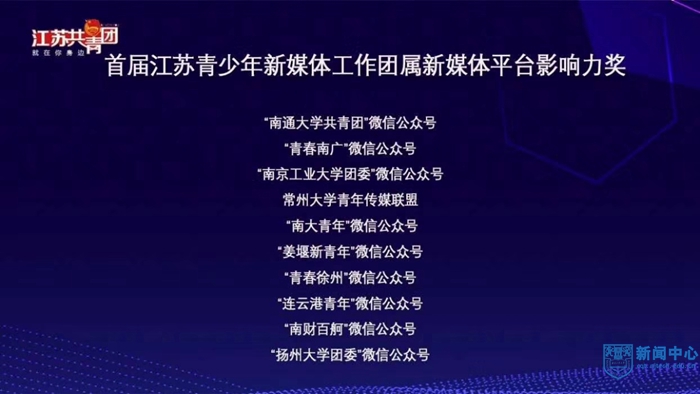 近日,由省委網信辦指導,江蘇團省委、江蘇青少年新媒體聯盟主辦的“首屆江蘇青少年新媒體工作優秀項目獎評選”活動揭曉獎項,我校榮獲“團屬新媒體平臺影響力獎”和“優秀新媒體作品獎”等兩個獎項。