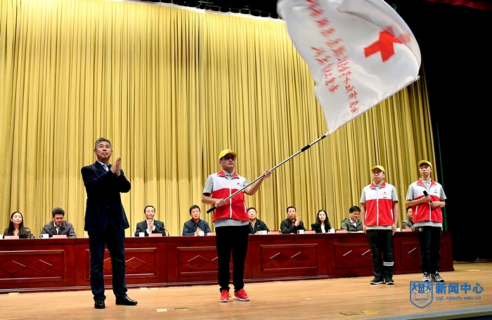 會上,聶城部長宣讀表彰決定,張杰副會長、牛生杰副校長為祁玉清老師頒發“江蘇省五一勞動獎章”等獎項。之后,朱興同老師介紹了我校師生連續4年為南京馬拉松提供醫療保障志愿服務的情況。隨后,志愿者代表徐永杰同學進行發言,向志愿者們分享了以往南京馬拉松醫療保障經歷與切身體會。緊接著,張杰副會長向南京市紅十字會應急救援志愿服務隊南京工業大學支隊授旗,支隊隊長雅鵬接旗并帶領志愿者進行莊嚴宣誓。