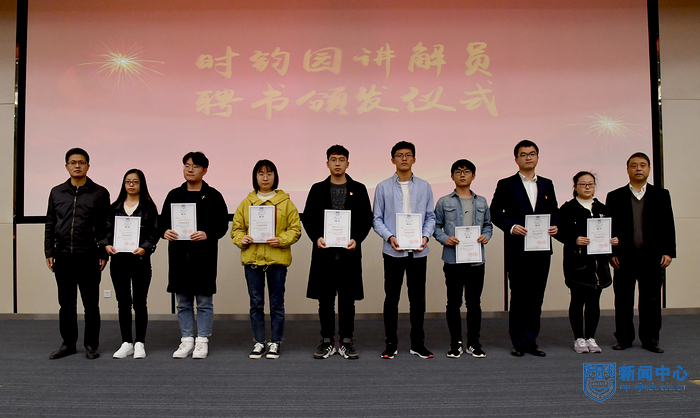 活動伊始,馬明輝老師與彭光成老師為韓欣等8位我校首批時鈞園講解員頒發聘書,該批講解員將擔負起為學生參觀、校友返校以及企業進校等活動提供時鈞園講解任務,傳播和弘揚時鈞精神。