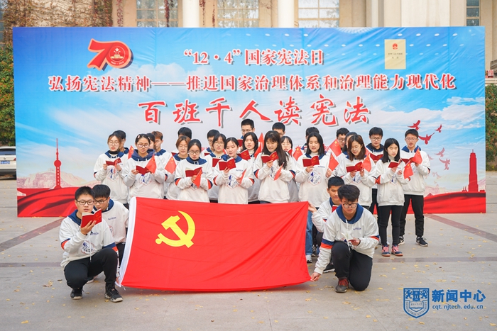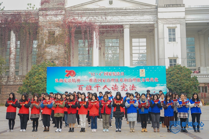 百班千人讀憲法,我是憲法朗讀者。“社會主義制度是中華人民共和國的根本制度。中國共產黨領導是中國特色社會主義最本質的特征。”“中華人民共和國的一切權力屬于人民。”在全國第二個憲法宣傳周期間,鏗鏘有力的憲法朗讀聲此起彼伏,久久回蕩在沉毅廣場。每人手持一本《中華人民共和國憲法》,100個班級在接力朗讀中深培法治觀念。
