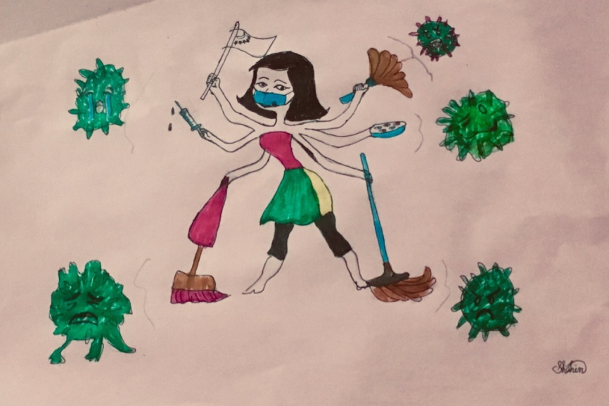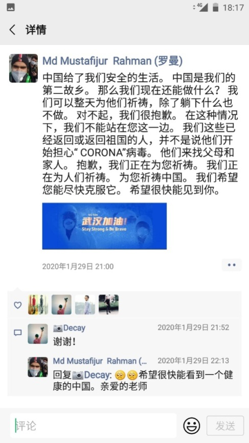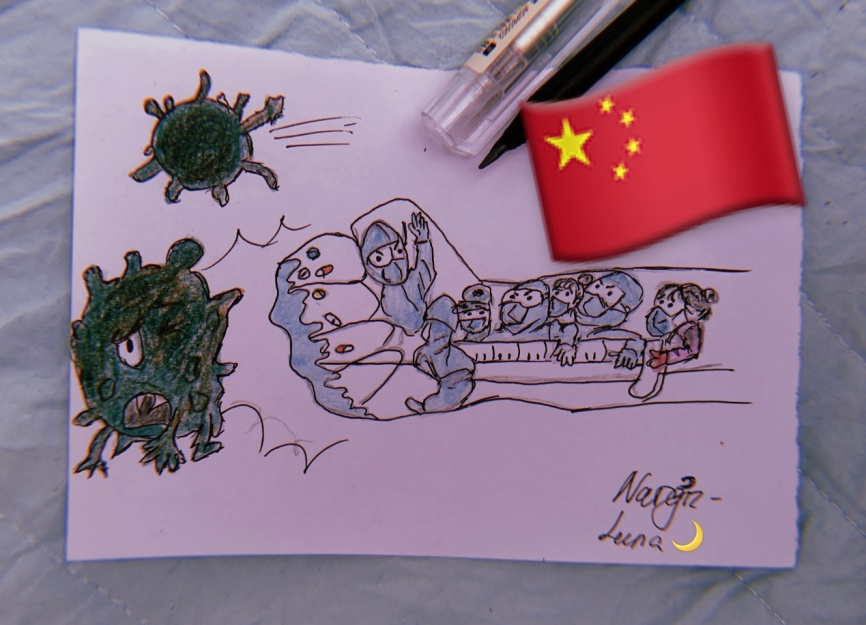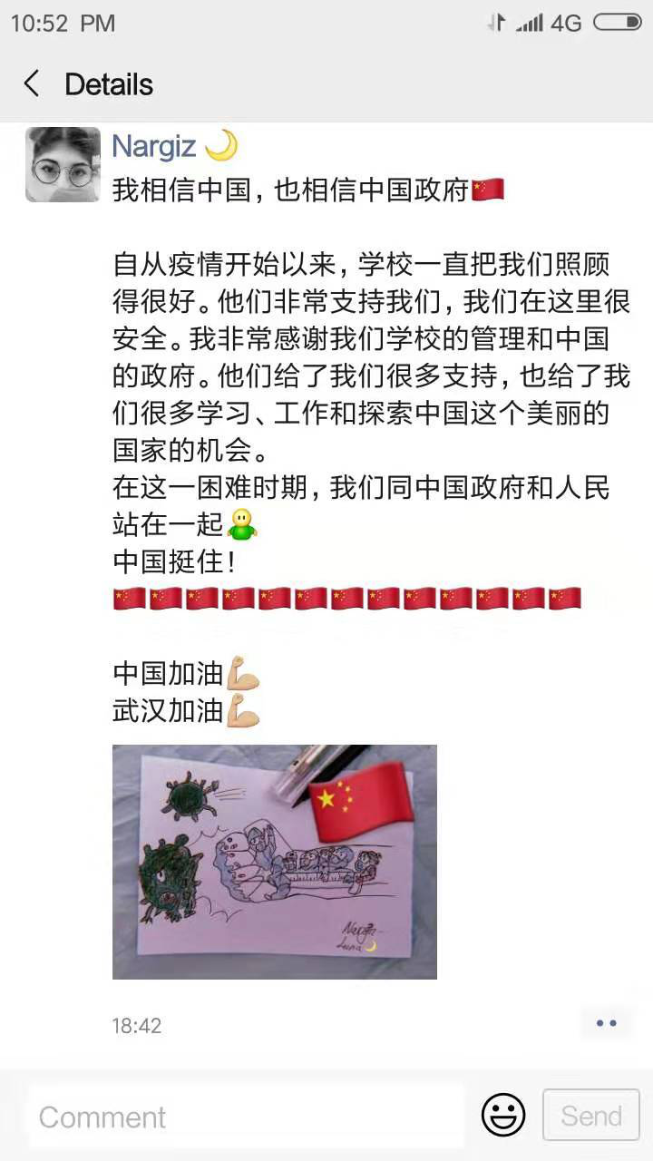 不僅如此,很多同學都在自己的朋友圈表達了對中國早日戰勝病毒的信心,來自哈薩克斯的2017級Nargiz Kamalova同學和來自孟加拉的2018級AKTER同學還創作了繪畫作品來為中國加油!