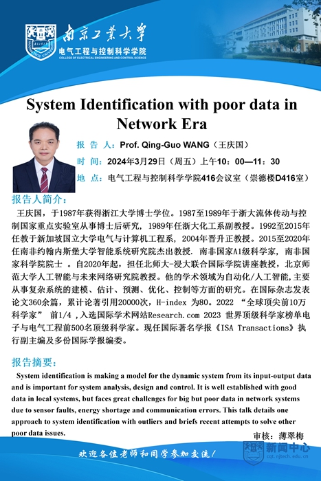 報告摘要:System identification is making a model for the dynamic system from its input-output data and is important for system analysis, design and control. It is well established with good data in local systems, but faces great challenges for big but poor data in network systems due to sensor faults, energy shortage and communication errors. This talk details one approach to system identification with outliers and briefs recent attempts to solve other poor data issues.