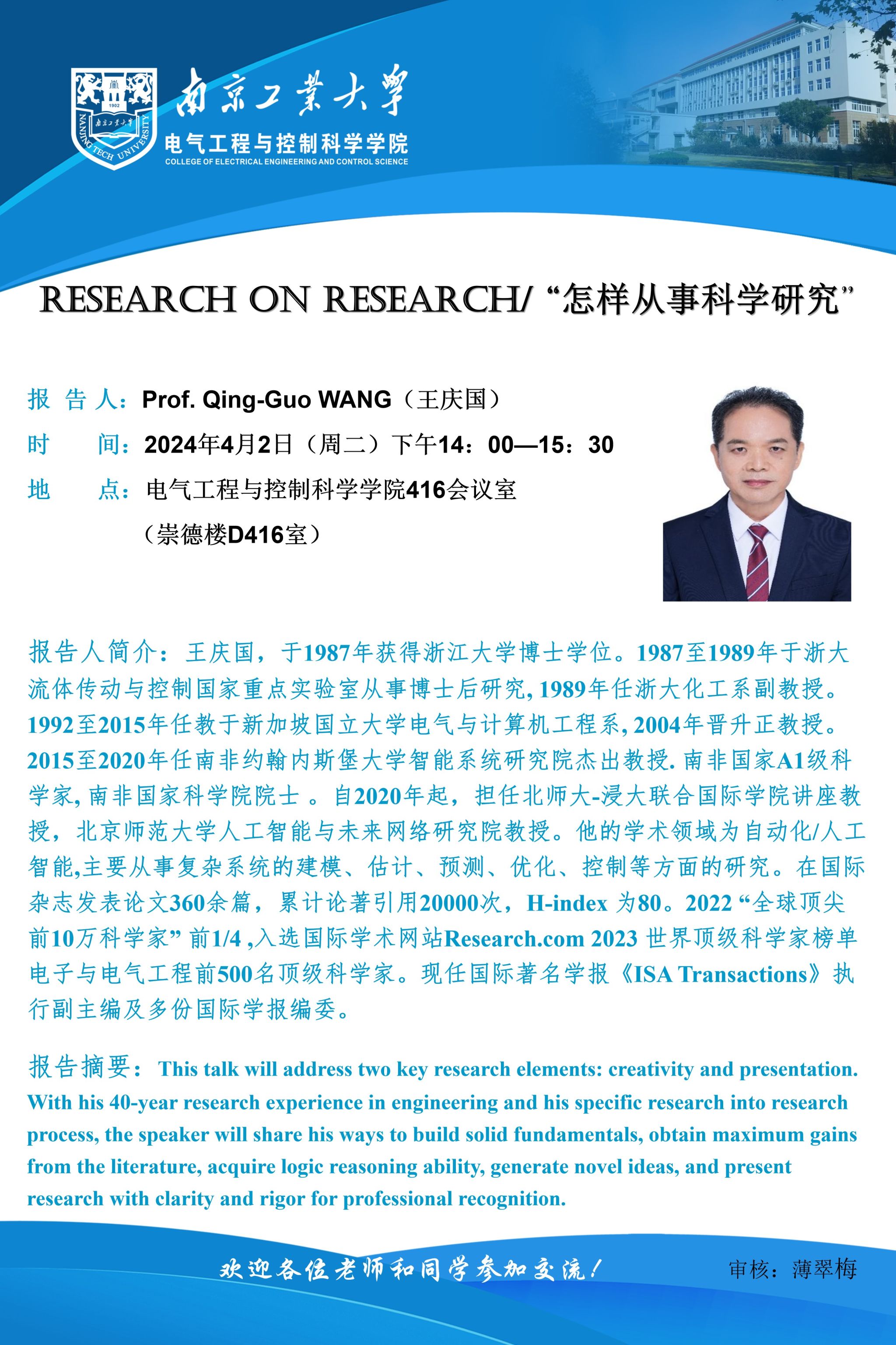 報告人簡介:王慶國,于1987年獲得浙江大學博士學位。1987至1989年于浙大流體傳動與控制國家重點實驗室從事博士后研究, 1989年任浙大化工系副教授。1992至2015年任教于新加坡國立大學電氣與計算機工程系, 2004年晉升正教授。2015至2020年任南非約翰內斯堡大學智能系統研究院杰出教授. 南非國家A1級科學家, 南非國家科學院院士 。自2020年起,擔任北師大-浸大聯合國際學院講座教授,北京師范大學人工智能與未來網絡研究院教授。他的學術領域為自動化/人工智能,主要從事復雜系統的建模、估計、預測、優化、控制等方面的研究。在國際雜志發表論文360余篇,累計論著引用20000次,H-index 為80。2022 “全球頂尖前10萬科學家” 前1/4 ,入選國際學術網站Research.com 2023 世界頂級科學家榜單電子與電氣工程前500名頂級科學家。現任國際著名學報《ISA Transactions》執行副主編及多份國際學報編委。