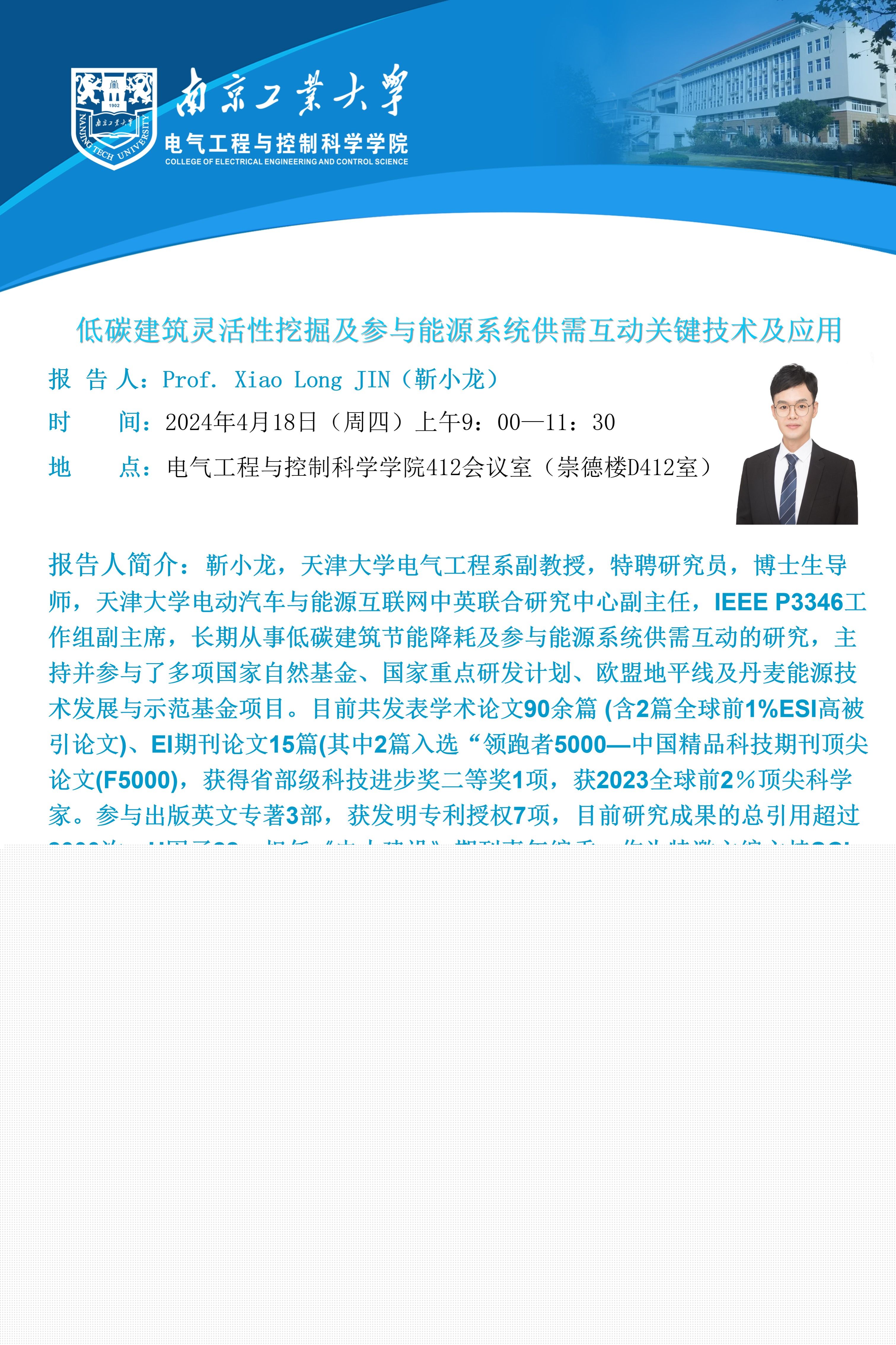 報告人簡介:靳小龍,天津大學電氣工程系副教授,特聘研究員,博士生導師,天津大學電動汽車與能源互聯網中英聯合研究中心副主任,IEEE P3346工作組副主席,長期從事低碳建筑節能降耗及參與能源系統供需互動的研究,主持并參與了多項國家自然基金、國家重點研發計劃、歐盟地平線及丹麥能源技術發展與示范基金項目。目前共發表學術論文90余篇 (含2篇全球前1%ESI高被引論文)、EI期刊論文15篇(其中2篇入選“領跑者5000—中國精品科技期刊頂尖論文(F5000),獲得省部級科技進步獎二等獎1項,獲2023全球前2%頂尖科學家。參與出版英文專著3部,獲發明專利授權7項,目前研究成果的總引用超過2000次,H因子22。擔任《電力建設》期刊青年編委,作為特邀主編主持SCI雜志專輯4次,作為國際會議分會場主席主持會議4次。