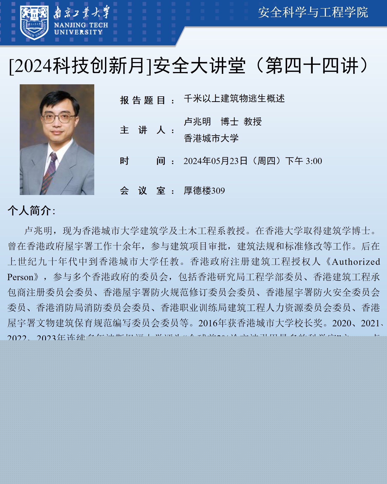 報告人簡介:盧兆明,現為香港城市大學建筑學及土木工程系教授。在香港大學取得建筑學博士。曾在香港政府屋宇署工作十余年,參與建筑項目審批,建筑法規和標準修改等工作。后在上世紀九十年代中到香港城市大學任教。香港政府注冊建筑工程授權人《Authorized Person》,參與多個香港政府的委員會,包括香港研究局工程學部委員、香港建筑工程承包商注冊委員會委員、香港屋宇署防火規范修訂委員會委員、香港屋宇署防火安全委員會委員、香港消防局消防委員會委員、香港職業訓練局建筑工程人力資源委員會委員、香港屋宇署文物建筑保育規范編寫委員會委員等。2016年獲香港城市大學校長獎。2020、2021、2022、2023年連續多年被斯坦福大學評為“全球前2%論文被引用最多的科學家”之一。盧教授目前研究方向主要為消防安全工程、人員流動(包括出行行為、客流、疏散及行為識別)和建筑管理與城市規劃三個板塊。多年以來盧教授在SCI/SSCI收錄期刊發表論文200篇,共領導/參與多項科研項目,其中擔任香港研究局的15項專項研究的首席研究員,與香港地鐵合作研究人員流動與消防問題等。