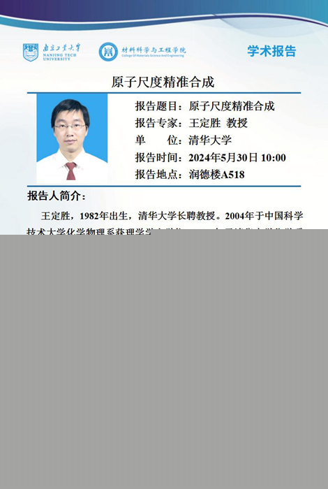 報告人簡介:王定勝,1982年出生,清華大學長聘教授。2004年于中國科學技術大學化學物理系獲理學學士學位。2009年于華大學化學系獲理學博士學位。2009至2012年在清華大學物理系從事博士后研究。2012年7月加入清華大學化學系。研究領域為無機納米材料化學,自2009年博士畢業以來,一直以無機納米合成化學為基礎主要從事金屬納米品、團簇及單原子為主的無機功能納米材料的合成、結構調控與儲化性能研究。2012年獲全國優秀博士學位論文獎。2013年獲國家優秀青年科學基金。2018年獲青年拔尖,2023年獲國家杰出青年科學基金。發表學術論文200余,含1篇Nature、1篇Nature Chem.、1篇Nature Nanotech.、3篇NatureCatal.、1篇Nature Synth.、45篇Angew.Chem, Int.Ed.、24篇J.Am.Chem.Soc.、20篇Adv, Mater.、13篇Nature Commun.等。2020-2023連續四年入選全球高被引科學家。
