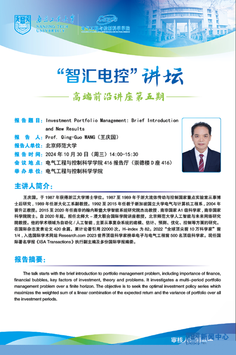 報(bào)告人簡(jiǎn)介:王慶國(guó),于1987年獲得浙江大學(xué)博士學(xué)位。1987至1989年于浙大流體傳動(dòng)與控制國(guó)家重點(diǎn)實(shí)驗(yàn)室從事博士后研究, 1989年任浙大化工系副教授。1992至2015年任教于新加坡國(guó)立大學(xué)電氣與計(jì)算機(jī)工程系, 2004年晉升正教授。2015至2020年任南非約翰內(nèi)斯堡大學(xué)智能系統(tǒng)研究院杰出教授. 南非國(guó)家A1級(jí)科學(xué)家, 南非國(guó)家科學(xué)院院士。自2020年起,擔(dān)任北師大-浸大聯(lián)合國(guó)際學(xué)院講座教授,北京師范大學(xué)人工智能與未來(lái)網(wǎng)絡(luò)研究院教授。他的學(xué)術(shù)領(lǐng)域?yàn)樽詣?dòng)化/人工智能,主要從事復(fù)雜系統(tǒng)的建模、估計(jì)、預(yù)測(cè)、優(yōu)化、控制等方面的研究。在國(guó)際雜志發(fā)表論文420余篇,累計(jì)論著引用22000次,H-index 為82。2022“全球頂尖前10萬(wàn)科學(xué)家”前1/4 ,入選國(guó)際學(xué)術(shù)網(wǎng)站Research.com 2023世界頂級(jí)科學(xué)家榜單電子與電氣工程前500名頂級(jí)科學(xué)家。現(xiàn)任國(guó)際著名學(xué)報(bào)《ISA Transactions》執(zhí)行副主編及多份國(guó)際學(xué)報(bào)編委。