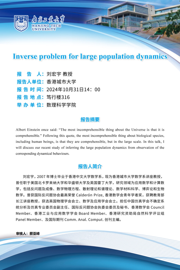 劉宏宇,2007年博士畢業于香港中文大學數學系,現為香港城市大學數學系講座教授,曾任職于美國北卡羅來納大學和華盛頓大學及英國雷丁大學,研究領域為應用數學和計算數學,包括反問題及成像、數學物理方程、散射理論和譜理論、數學材料科學、博論和生物數學。曾獲國際反問題協會最高榮譽Calderón Prize,香港數學會青年學者獎,獲聘教育部長江講座教授,獲選英國物理學會會士、數學及應用學會會士。擔任中國仿真學會不確定系統分析及仿真專業委員會副主任、國際反問題協會執委會委員及秘書、香港數學會CouncilMember、香港工業與應用數學學會Board Member、香港研究資助局自然科學評議組PanelMember、及國際期刊Comm.Anal.Comput.創刊主編。