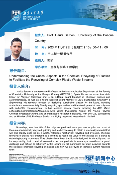報告人簡介:Haritz Sardon is an Associate Professor in the Macromolecules Department at the Faculty of Chemistry, University of the Basque Country (UPV/EHU), Spain. He serves as an Associate Editor forPolymer Chemistryand is an Editorial Board Member ofChemical ScienceandMacromolecules, as well as a Young Editorial Board Member ofACS Sustainable Chemistry & Engineering. His research focuses on designing sustainable plastics for the future, including scalable and environmentally friendly recycling approaches and the development of new polymers with end-of-life considerations. He has received several honors, including theACS Macro Letters/Biomacromolecules/MacromoleculesYoung Investigator Award, the Young Polymer Chemist Investigator Award, and an Ikerbasque Research Fellowship. With over 220 publications and an H-index of 52, Professor Sardon is a highly respected researcher in his field.