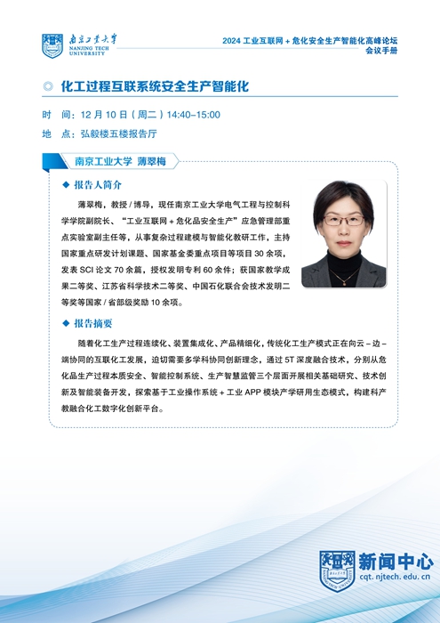 9 | 薄翠梅 | 南京工業(yè)大學(xué) | 化工過程互聯(lián)系統(tǒng)安全生產(chǎn)智能化 |