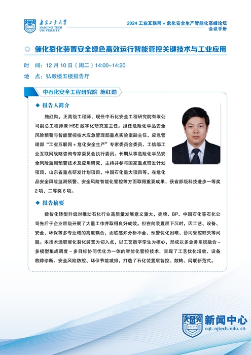 7 | 施紅勛 | 中石化安全工程研究院有限公司 | 催化裂化裝置安全綠色高效運(yùn)行智能管控關(guān)鍵技術(shù)與工業(yè)應(yīng)用 |