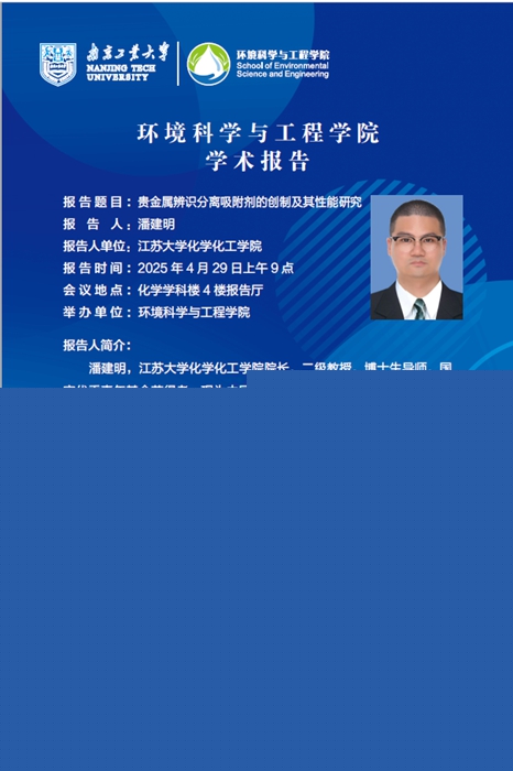 報告人簡介:潘建明,江蘇大學化學化工學院院長,二級教授,博士生導師,國家優秀青年基金獲得者。現為中國化工學會分子辨識分離工程專委會委員、分離與過濾專委會委員、《Desalination》和《鹽湖研究》編委。長期從事分子印跡強化辨識機制、乳液液滴反應器可控制備功能吸附劑、天然活性分子與戰略金屬離子分離純化的研究,以第一/通訊作者在Chem. Soc. Rev.、Adv. Mater.、Small等期刊發表SCI論文150余篇;授權中國發明專利30余項,PCT專利授權5項;主持國家自然科學基金8項、江蘇省重點研發項目等省部級項目15項;獲江蘇省科技進步二等獎1項(第一)、中國石油與化學工業聯合會科技進步二等獎1項(第一);主編了《分子印跡技術及其研究進展》、《現代分子印跡辨識技術》和《分離科學與技術》。