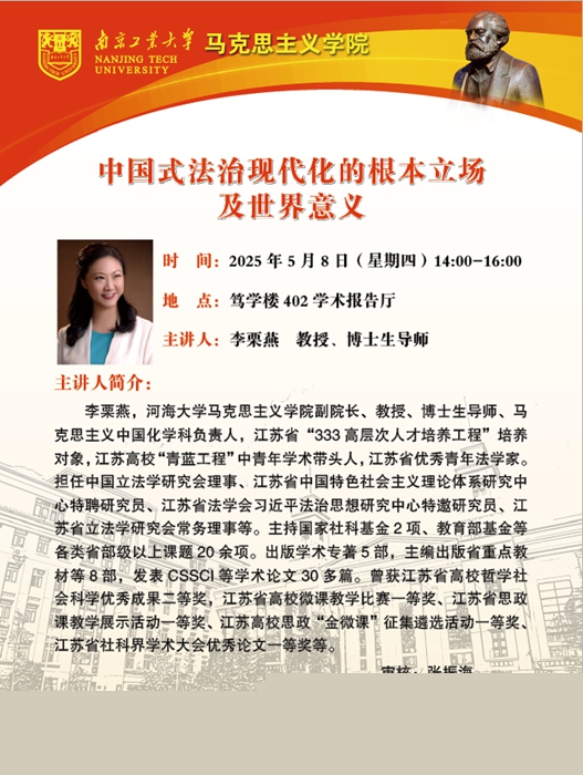 李栗燕,河海大學馬克思主義學院副院長、教授、博士生導師、馬克思主義中國化學科負責人,江蘇省“333高層次人才培養工程”培養對象,江蘇高校“青藍工程”中青年學術帶頭人,江蘇省優秀青年法學家。擔任中國立法學研究會理事、江蘇省中國特色社會主義理論體系研究中心特聘研究員、江蘇省法學會習近平法治思想研究中心特邀研究員、江蘇省立法學研究會常務理事等。主持國家社科基金2項、教育部基金等各類省部級以上課題20余項。出版學術專著5部,主編出版省重點教材等8部,發表CSSCI等學術論文30多篇。曾獲江蘇省高校哲學社會科學優秀成果二等獎,江蘇省高校微課教學比賽一等獎、江蘇省思政課教學展示活動一等獎、江蘇高校思政“金微課”征集遴選活動一等獎、江蘇省社科界學術大會優秀論文一等獎等。