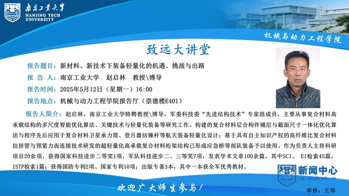 趙啟林,南京工業大學特聘教授\博導,軍委科技委“先進結構技術”專家組成員,主要從事復合材料高承載結構的多尺度智能優化算法、關鍵技術與輕量化裝備等研究工作。構建的復合材料層合構件鋪層與截面尺寸一體化優化算法與程序先后應用于復合材料衛星承力筒、登月器紡錘桿等航天裝備輕量化設計;基于具有自主知識產權的高纖維比復合材料拉擠管與預緊力齒連接技術研發的超輕量化高承載復合材料桁架結構已形成應急橋等部隊裝備予以使用。作為負責人主持科研項目20余項,獲得國家科技進步二等獎1項,軍隊科技進步二、三等獎7項;發表學術文章100余篇,其中SCI、 EI檢索45篇,ISTP檢索1篇;獲得國防專利2項、國家專利10項;出版專著3本,其中一本獲全軍優秀教材。