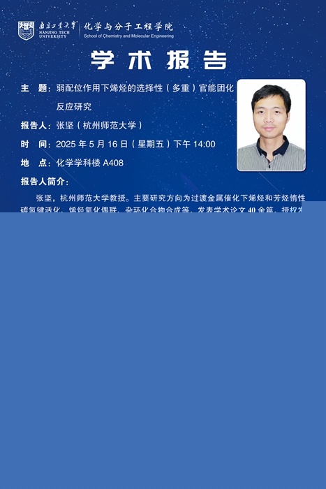 報(bào)告人簡介:張堅(jiān),杭州師范大學(xué)教授。博士畢業(yè)于新加坡南洋理工大學(xué)。2015年全職加入杭州師范大學(xué),主要研究方向?yàn)椋哼^渡金屬催化下烯烴和芳烴惰性碳?xì)滏I(不對稱)活化、烯烴氧化偶聯(lián)、雜環(huán)化合物合成等,發(fā)表學(xué)術(shù)論文40余篇,授權(quán)發(fā)明專利11項(xiàng),出版專著1部。擔(dān)任Angew. Chem.、ACS Catal.、Org. Chem. Front.、Chem. Commun.、Org. Lett.、Org. Biomol. Chem.、Adv. Synth. Catal.等國際知名化學(xué)期刊審稿人。承擔(dān)多項(xiàng)國家、浙江省自然科學(xué)基金項(xiàng)目,多次在全國化學(xué)年會(huì)作學(xué)術(shù)報(bào)告。獲“西湖學(xué)者”(2015),131人才(2017);指導(dǎo)學(xué)生獲浙江省大學(xué)生化學(xué)競賽一等獎(jiǎng)五次、二等獎(jiǎng)和三等獎(jiǎng)多次;指導(dǎo)國家級大學(xué)生創(chuàng)新創(chuàng)業(yè)訓(xùn)練項(xiàng)目和“研究生國家獎(jiǎng)學(xué)金”多項(xiàng);天津市自然科學(xué)二等獎(jiǎng)(“金屬有機(jī)催化及基礎(chǔ)理論研究”,2008年)。