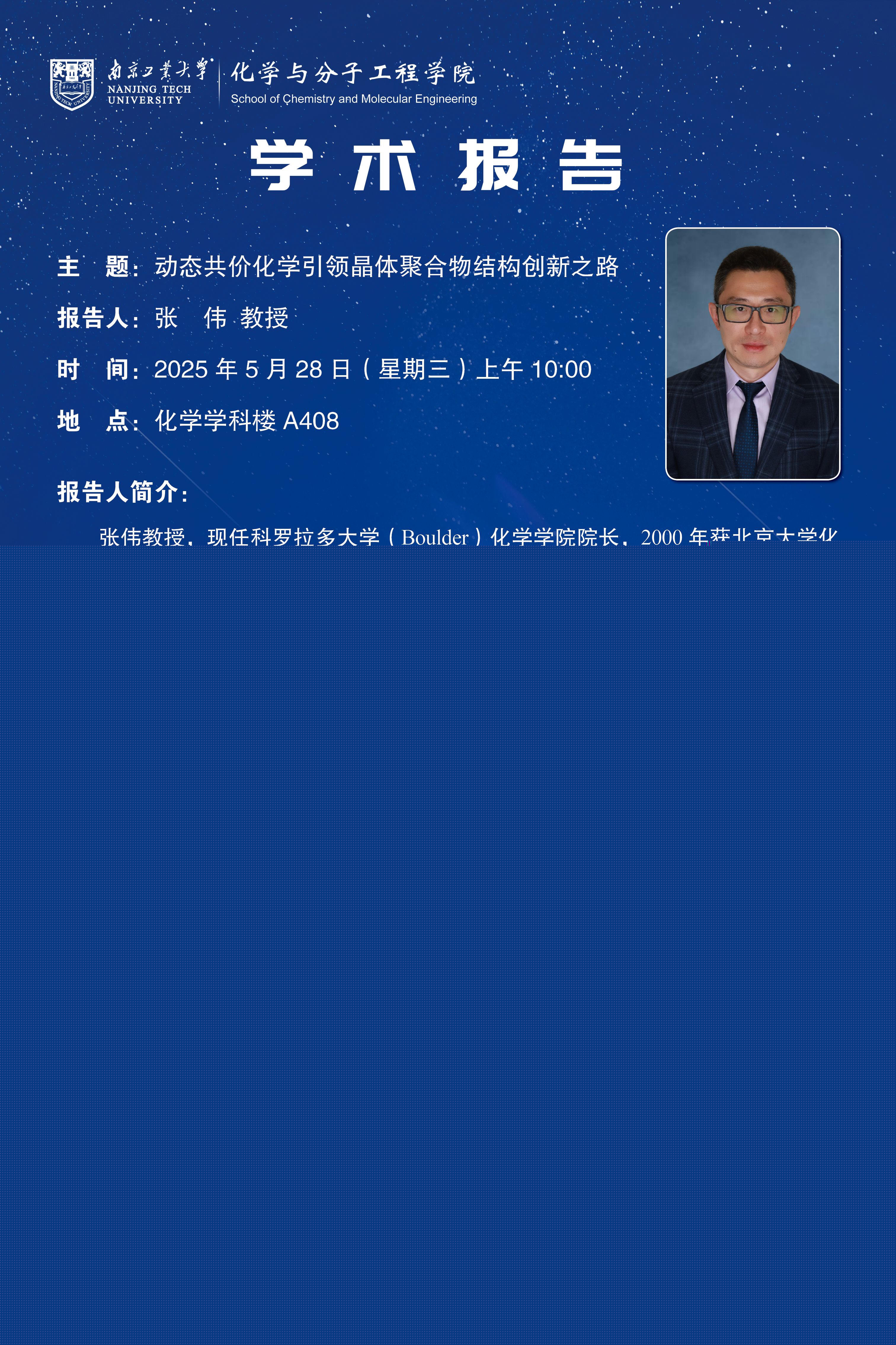 報(bào)告人簡介:張偉教授,現(xiàn)任科羅拉多大學(xué)(Boulder)化學(xué)學(xué)院院長,2000年獲北京大學(xué)化學(xué)學(xué)士學(xué)位;2005年在伊利諾伊大學(xué)(UIUC)Jeffrey Moore院士指導(dǎo)下取得化學(xué)博士學(xué)位;隨后加入麻省理工學(xué)院(MIT)美國科學(xué)院院士Timothy Swager團(tuán)隊(duì)從事博士后研究。2008年起在科羅拉多大學(xué)(Boulder)化學(xué)與生物化學(xué)系建立獨(dú)立研究團(tuán)隊(duì)。研究聚焦動態(tài)共價(jià)化學(xué)及其在功能材料開發(fā)中的應(yīng)用,主要致力于設(shè)計(jì)新型有機(jī)-雜化材料體系,以解決能源與環(huán)境領(lǐng)域的重大挑戰(zhàn)。憑借卓越的學(xué)術(shù)貢獻(xiàn),榮獲多項(xiàng)榮譽(yù),包括:美國國家科學(xué)基金會CAREER獎(jiǎng)(NSF最具聲望的早期職業(yè)獎(jiǎng)),阿爾弗雷德?P?斯隆基金會研究獎(jiǎng)(Sloan Research Fellowship),美國化學(xué)會科羅拉多分會杰出科學(xué)家獎(jiǎng)(2022),當(dāng)選美國國家發(fā)明家科學(xué)院高級會員(NAI Senior Member, 2023),科羅拉多大學(xué)最高學(xué)術(shù)榮譽(yù)——杰出學(xué)者獎(jiǎng)(2024),連續(xù)入選科睿唯安“全球高被引科學(xué)家”,蘇黎世聯(lián)邦理工學(xué)院(ETH Zürich)客座教授席位。