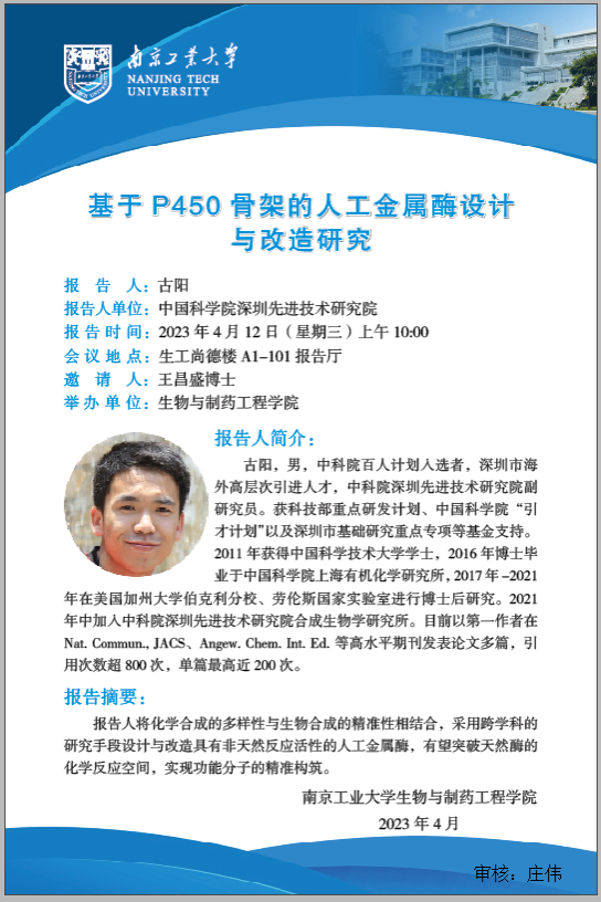 報告人簡介:古陽,男,中科院百人計劃入選者,深圳市海外高層次引進人才,中科院深圳先進技術研究院副研究員。獲科技部重點研發計劃、中國科學院“引才計劃”以及深圳市基礎研究重點專項等基金支持。2011年獲得中國科學技術大學學士,2016年博士畢業于中國科學院上海有機化學研究所,2017年-2021年在美國加州大學伯克利分校、勞倫斯國家實驗室進行博士后研究。2021年中加入中科院深圳先進技術研究院合成生物學研究所。目前以第一作者在Nat. Commun., JACS、Angew. Chem. Int. Ed.等高水平期刊發表論文多篇,引用次數超800次,單篇最高近200次。